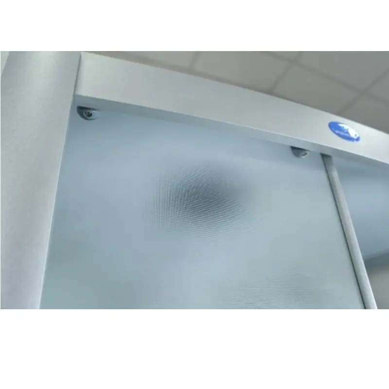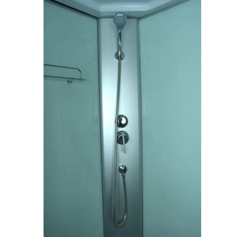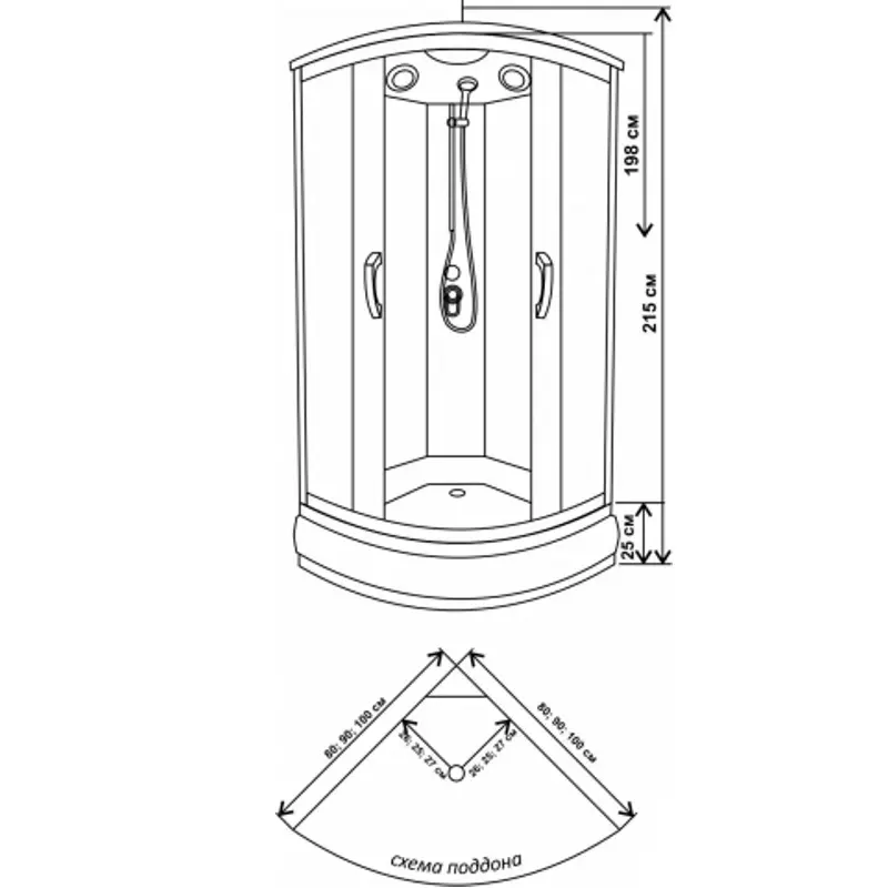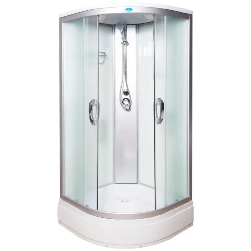 Душевая кабина Водный мир имеет размер 100х100 см. Форма — четверть круга , цвет хром, исполнение полотна двери матовое. Механизм открывания раздвижной.