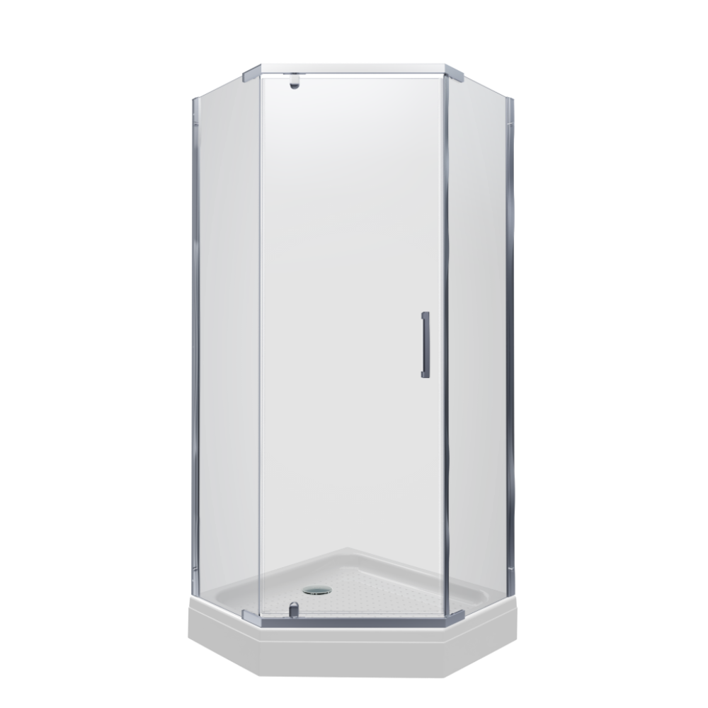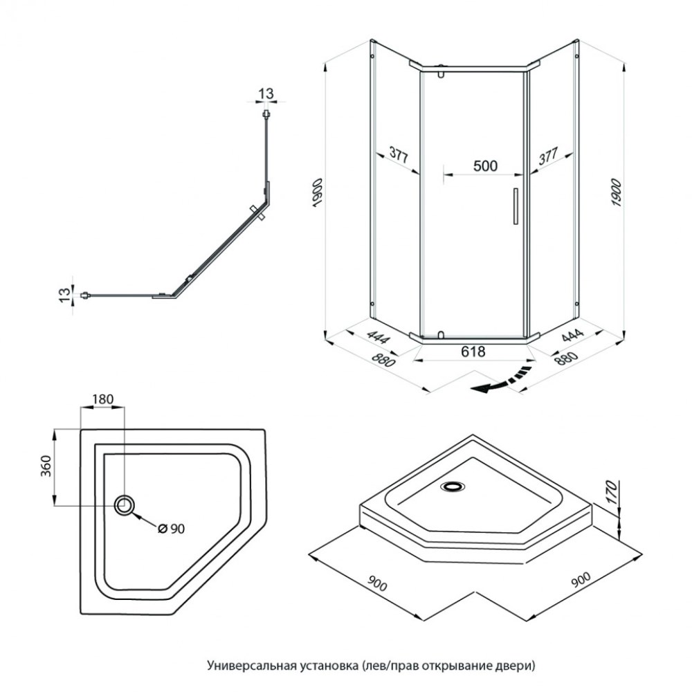 Душевой уголок Triton Дека имеет размер 90х90 см. Форма — пятиугольная, цвет профиля — хром, исполнение полотна двери — прозрачное. Конструкция состоит из 3 секций. Распашная механизм открывания. Устанавливается в облицованный кафелем угол ванной комнаты на поддон или на пол.
