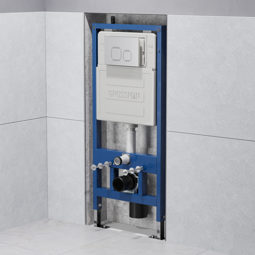 Инсталляция для унитаза Grossman — это система, предназначенная для установки подвесного унитаза. Конструкция представляет собой прочную раму и бачок скрытого монтажа объемом 9 литров.