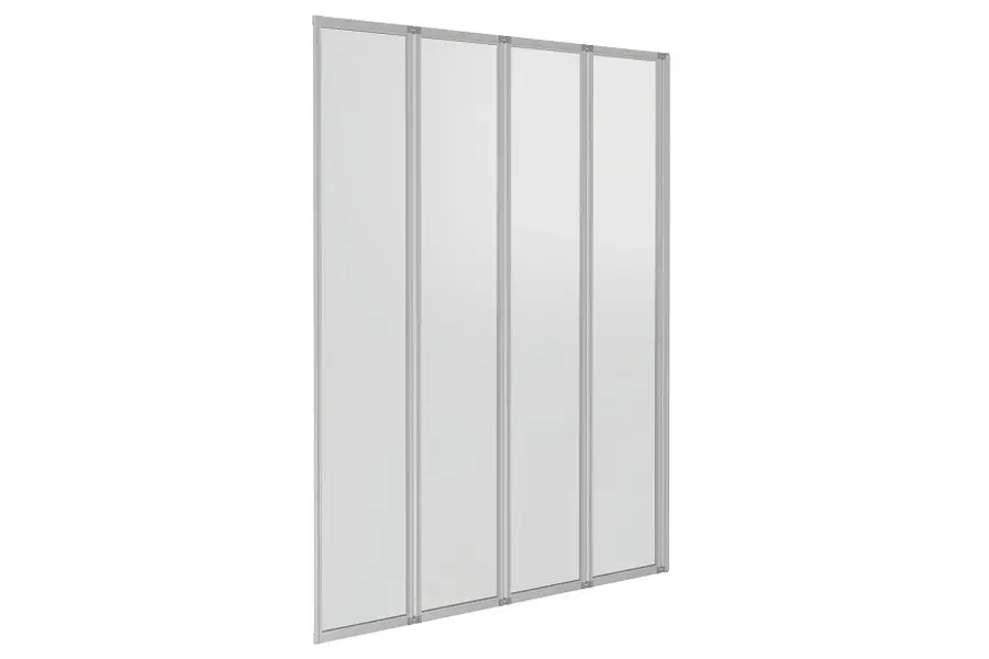 Шторка для ванны Bas Screen обладает размером 100х140 см. Конструкция состоит из четырёх секций: одной неподвижной и трёх складных. Устанавливается на любые прямоугольные ванны с ровными горизонтальными бортами.